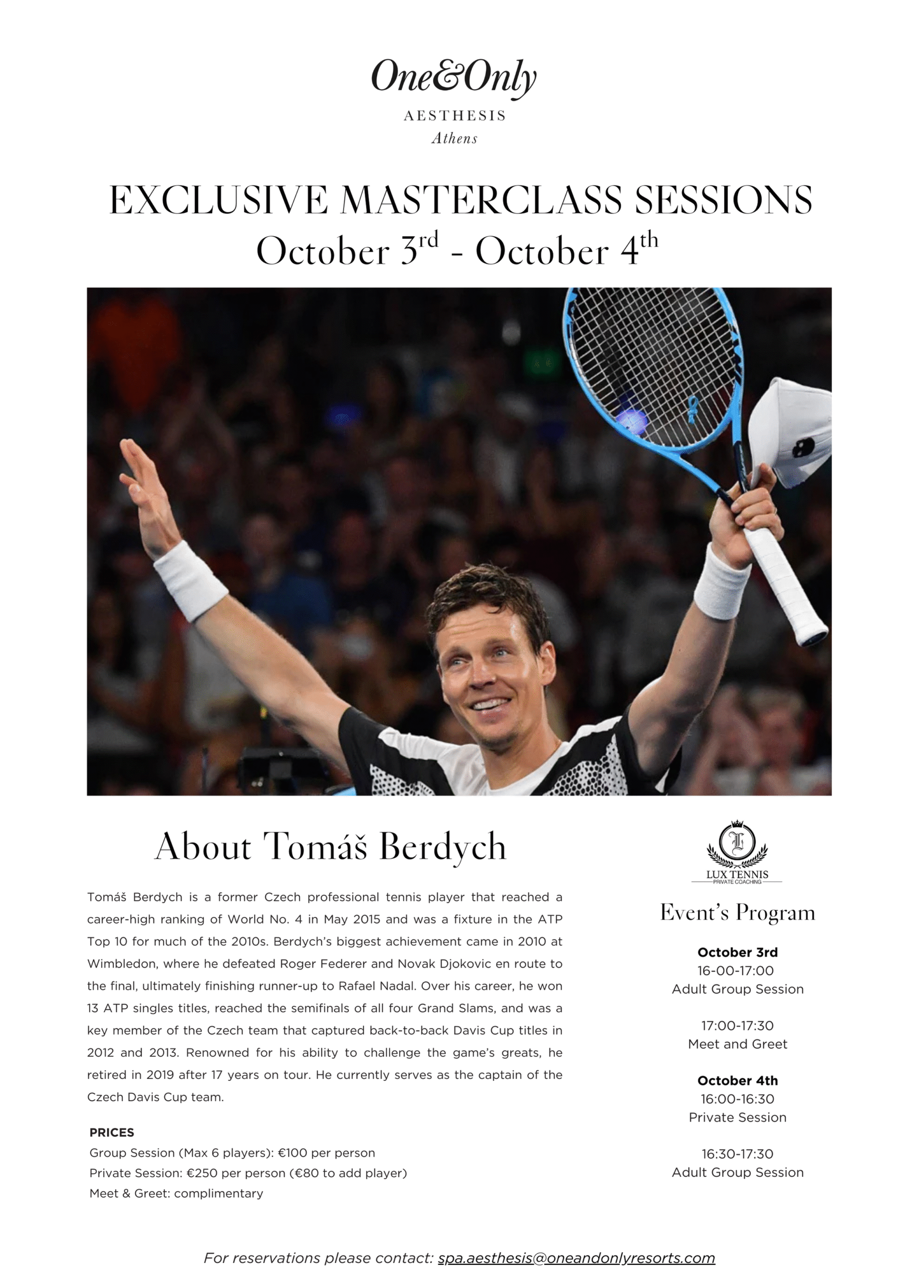 A cornerstone of the ATP Tour’s “Big Four” era challengers, Berdych has 13 ATP titles to his name and victories over every member of the Big Three, Federer, Nadal, and Djokovic, across the Grand Slams. Known for his powerful serve, crisp ball-striking, and tactical precision, Berdych brings a wealth of experience from competing at the sport’s highest levels. This is your chance to learn from one of the game’s greats and take your tennis to the next level.